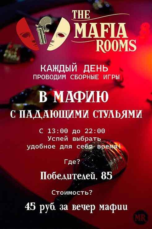 Пространство TheMafiaRooms (Зе Мафия Румс) расположено в Центральном районе Минска, рядом с набережной Свислочи. Это клубный формат для гостей, где создаётся особая атмосфера интеллектуального отдыха и приватности. Пространство работает ежедневно, предоставляя возможность провести вечер в необычном формате — от классической игры в «Мафию» до уединённых встреч в VIP-залах.